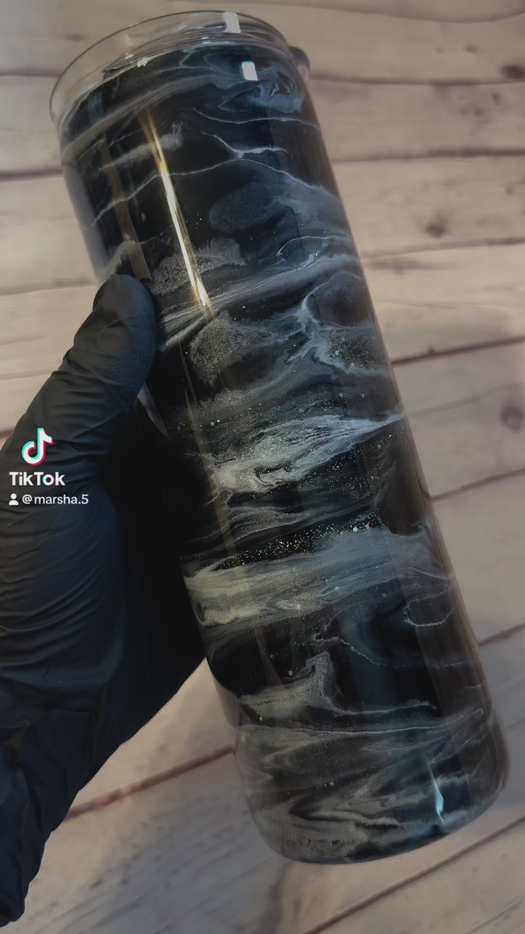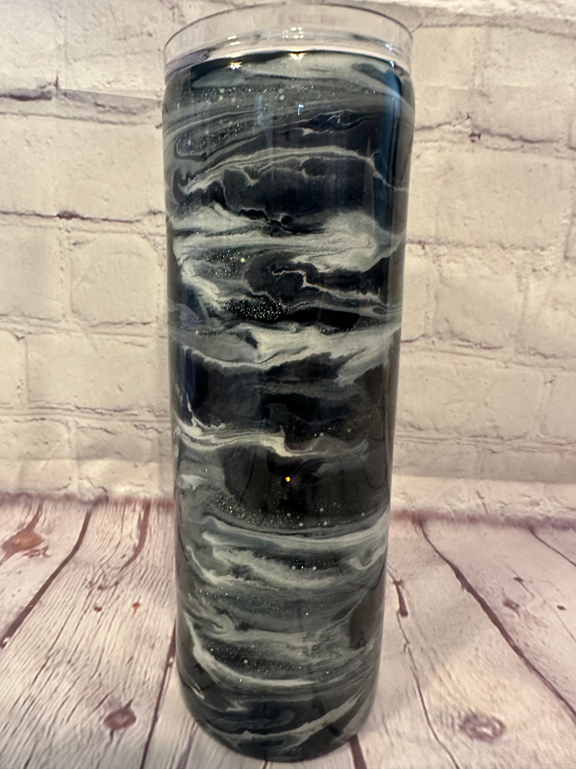 20 ounce straight skinny alcohol swirl tumbler with secret sauce glitter. Grays, Silver, Black and White.